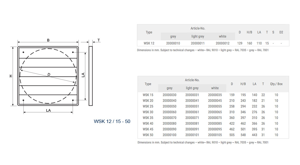 Type | Article-No. | D | H/B | LA | T | Qty./ Box | Free cross-section (cm²) |