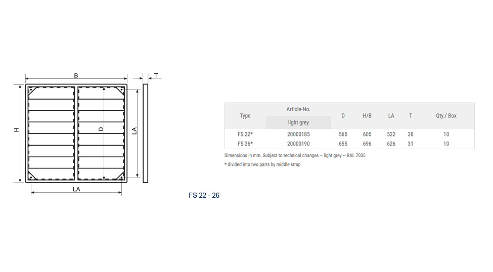 | Type | Article-No. | D | H/B | LA | T | Qty./ Box | Free cross-section (cm²) |
